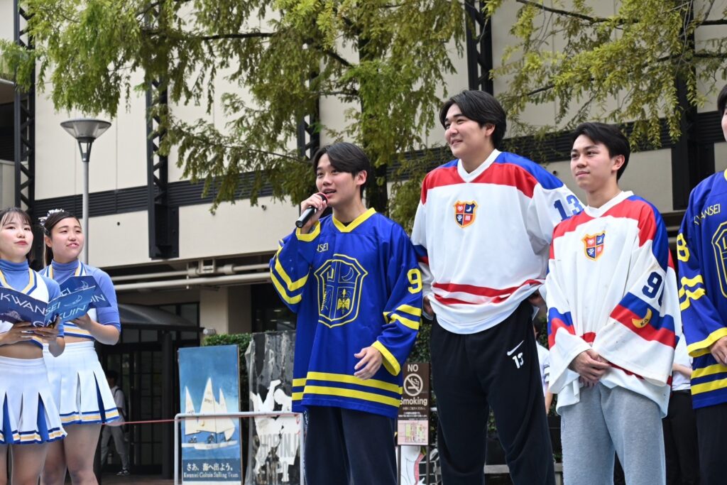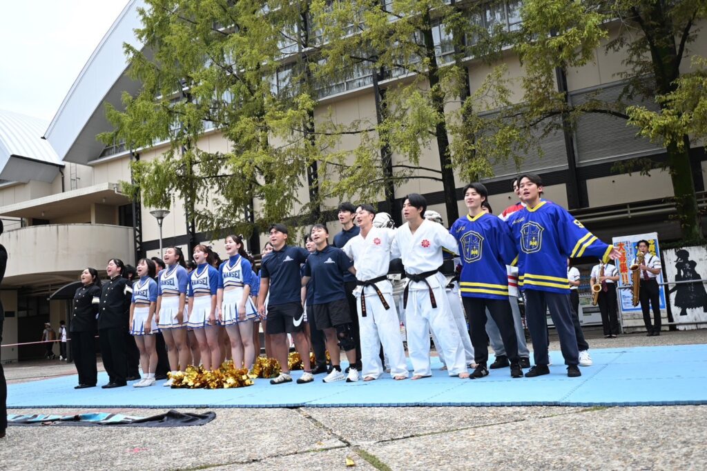 当日は、拳法部の実演やアイスホッケー部の注目選手紹介、試合告知、応援団総部からのエール演舞を行い、開催場所を変更したことにより、多くの方に見ていただくことができました✨